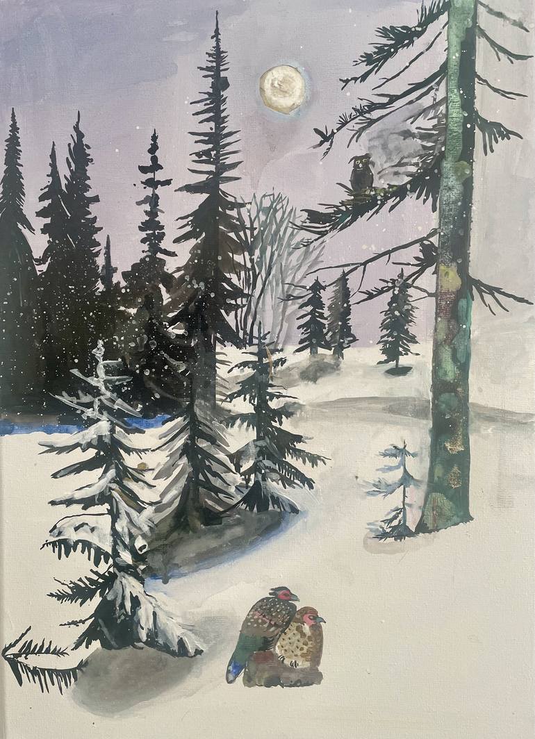 Freshly laid snow cover the ground and sprinkle glitter dust over the pines , a pair of partridges nestle against each others warm feathers .