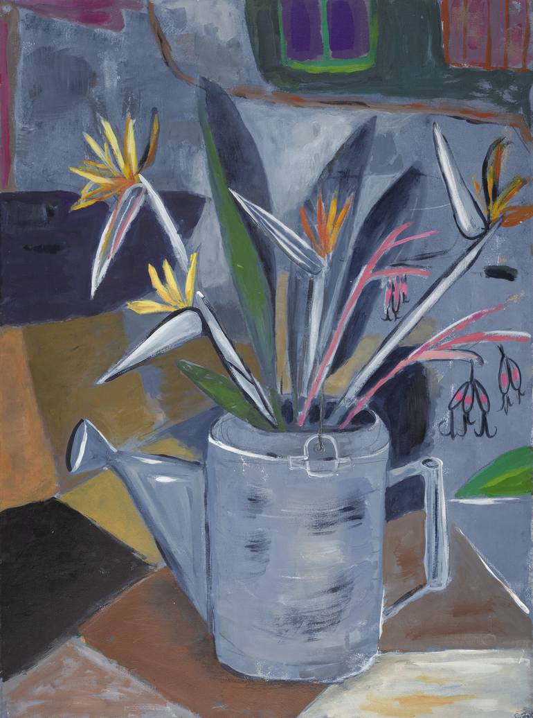 These exotic flowers grow easily in my garden needing little water or care. I love the strong shapes and personality of the Birds of Paradise. The Queens Tears are a bromeliad that blooms in the very early spring. The deep pink flowers with black accents are amazing to behold. I chose the old water...