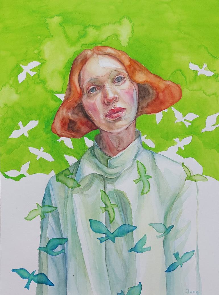 Work of Dunja Jung is strongly dedicated exploring watercolor medium, often executed on different surfaces such as paper, canvas and aqua board. Female portraits are the starting point in many of her artworks. Artist is using portraits as tool of expressing personally related emotions and sometimes portrait is used to tell some general social stories.