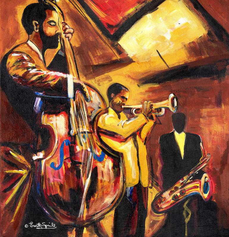 An American painter, photographer, and print-maker, Everett Spruill is an innovator. Born in 1954 in Birmingham, Alabama USA. Everett Spruill attended Berea College, where he majored in Business. It was during this time that he painted watercolor landscapes and portraits in the tradition of the French Impressionist, but did not seriously entertain the idea of a career in the arts. While managing a Hotel in Miami, and with frequent visits to the Miami Museum, a Picasso exhibition changed his mind as he was inspired by the simplicity of the work and the geometric patterns that formed the images. After relocating to Orlando, Spruill took up painting seriously and it was after two "accidental paintings" that he found his success. Known as The "Old School Jazz and Blues" series Everett creates paintings and collages, inspired by Romare Bearden, out of a variety of materials. From that time on Spruill consistently created increasingly complex variations of recycled and re-purposed materials focusing on Jazz as a central theme. Spruill constantly challenges himself to source new materials and expand his resources. His first radical shift came in 1999, with the "Tribal Rhythms Series" in which he employs interlocking geometric shapes combined with graffiti techniques. It was around this time as well that he created his first abstract prints in screen printing, linoleum cuts, and offset lithography. During the following decade, Spruill introduced texture into his art, which he came to call "Nuvo-stained glass" painting for its transparent qualities. From the mid-1990s to 2010, Spruill created a large body of work that responded in a general way to the childlike simplicity of creating art. During this time, the increasingly abstract collages of Spruill's paintings gave way to a multitude of materials from electronic components, textiles, recycled wallpaper, and decorative architectural elements. To create these works, the artist used appropriated materials and digital technologies. In 2017, Spruill began making wire sculptures for public spaces and developing architectural projects. Still residing in Orlando Florida with his many accolades, Everett Spruill prints and paintings are most famous for his work in the areas of collage and cubist abstraction.