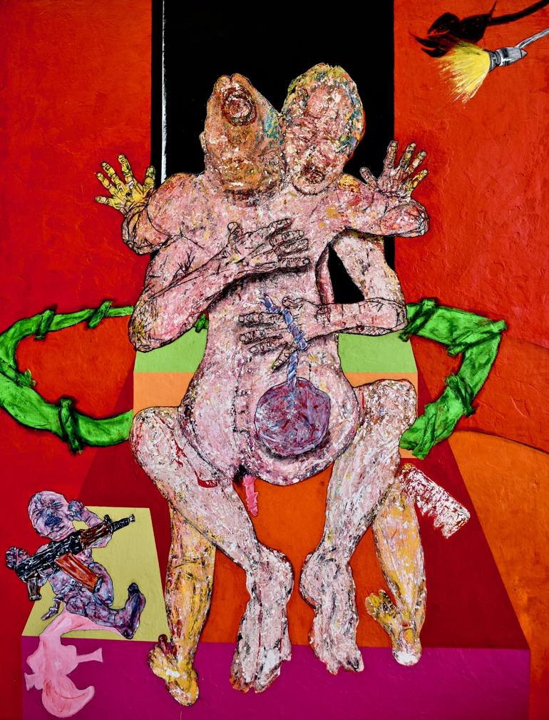 This work is the left piece of Triptych "Birth of Burden", a ceremony staged, two figures embrace, in agony a baby is born, ripped out by placenta, armed, to become soldier. A female figure brace, on all fours above a grave, against a downward pulling force, with male figure wrapped around her with ...