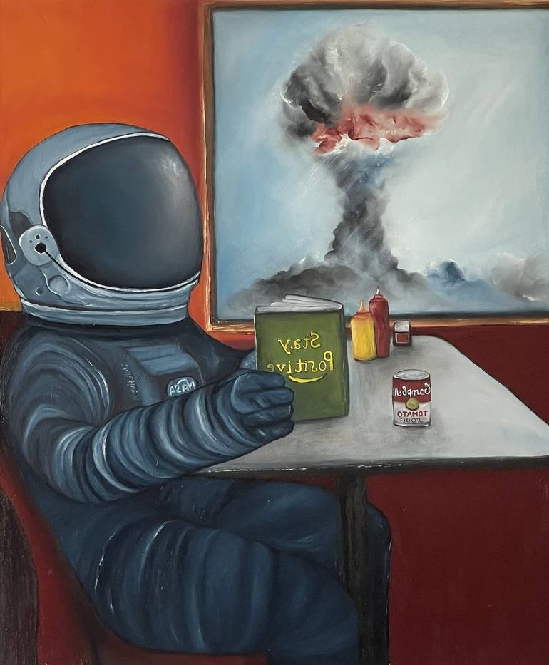 "Birthday lunch" oil on canvas 60x73 cm The painting is very surreal and ironic, as it contrasts the normality of the cafe scene with the apocalyptic background. The cosmonaut seems to be unaware or indifferent to the disaster outside, and he tries to keep a positive attitude by reading a self-help...