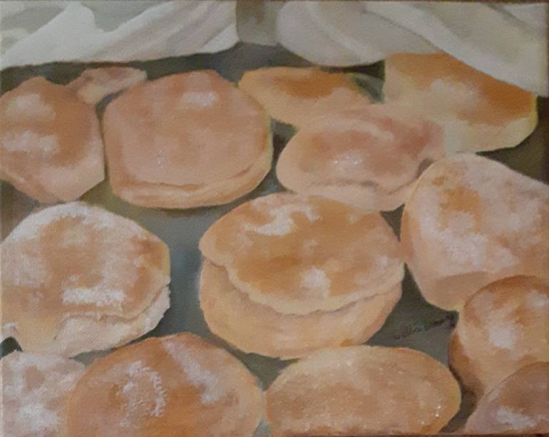 My mama had just taken out fresh hand made biscuits which smelled so good looked good and quickly tasted good. As soon as I saw them come out I thought, I have to paint that. So I did.