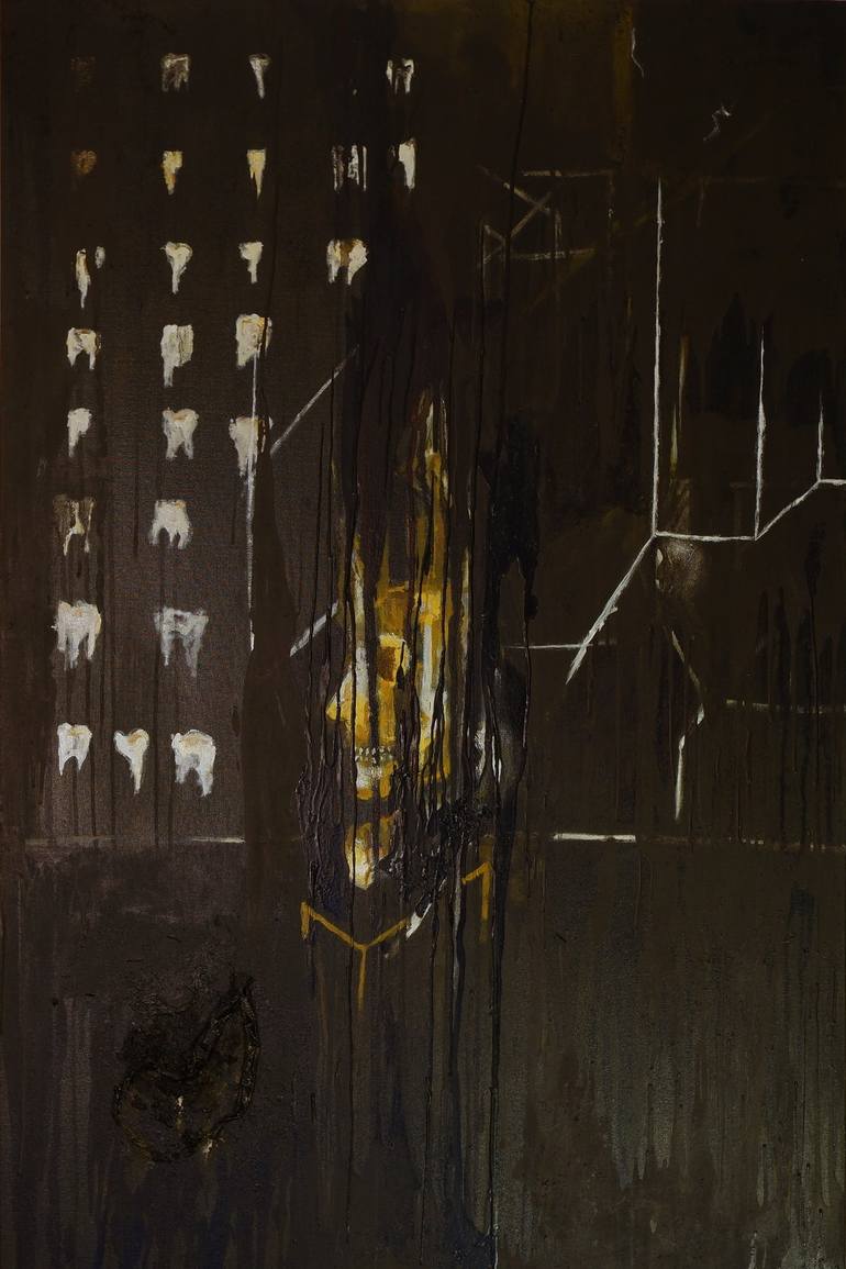 Encaustic and mixed media Artist Manifesting religious non-iconic superior beings by worshipping archetypal materials. Paraffin, conjoined with soil and ash, imprint on the canvas points from the innermost journey of the descent Katabasis. The metallic elements combined with the wooden ones -given to me in pieces- are placed with other materials in points and symbolic compounds meaning the beginning and the intermediate. Skin, hairs, bones, feathers, whitewash, concrete, soil, ash; elements or materials, symbols or concepts, are given in order to both decipher and encrypt those points and references. Ancient and primitive concepts are reprinted in the post-modern. The dead being, the insect, wine and honey resurface what was kept undisclosed.