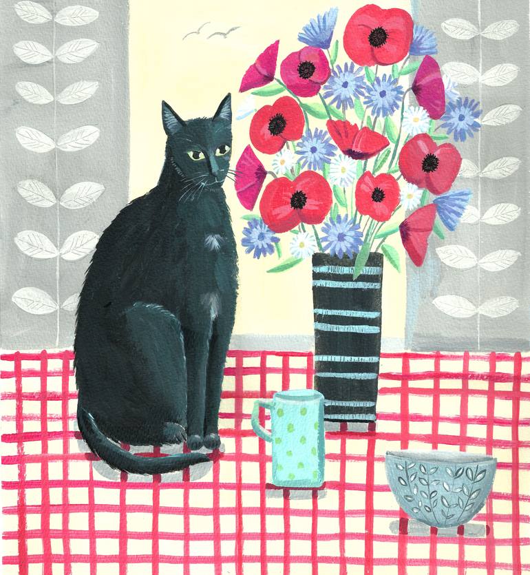 Lucky the young black cat sits on a red check table cloth with a vase of poppies, daisies and cornflowers with a bowl and mug. Painted on Bockingford watercolour paper and mounted onto white board.