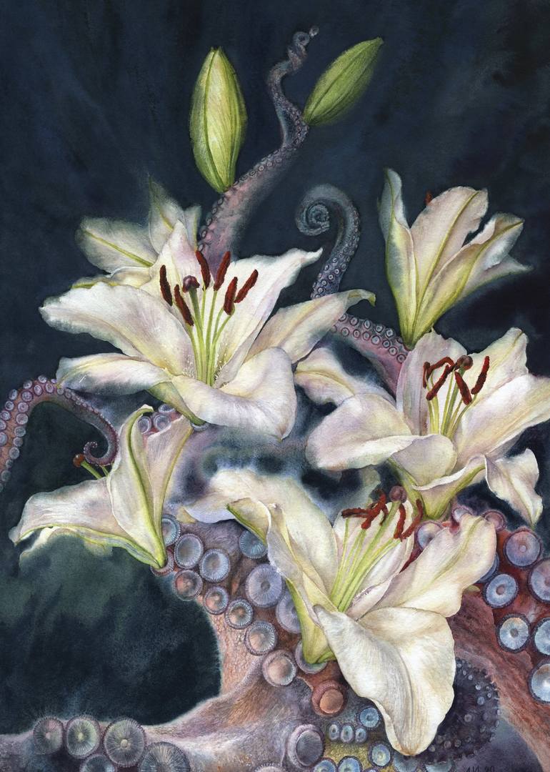 These lilies are from my archetypal dream. The white lily, a sacred flower, represents purity, grace, and virtue, while the tentacles of the octopus, a creature from the mystical depths, symbolize the hidden aspects of the unconscious mind and the adaptability of the shadow side of personality. I wo...