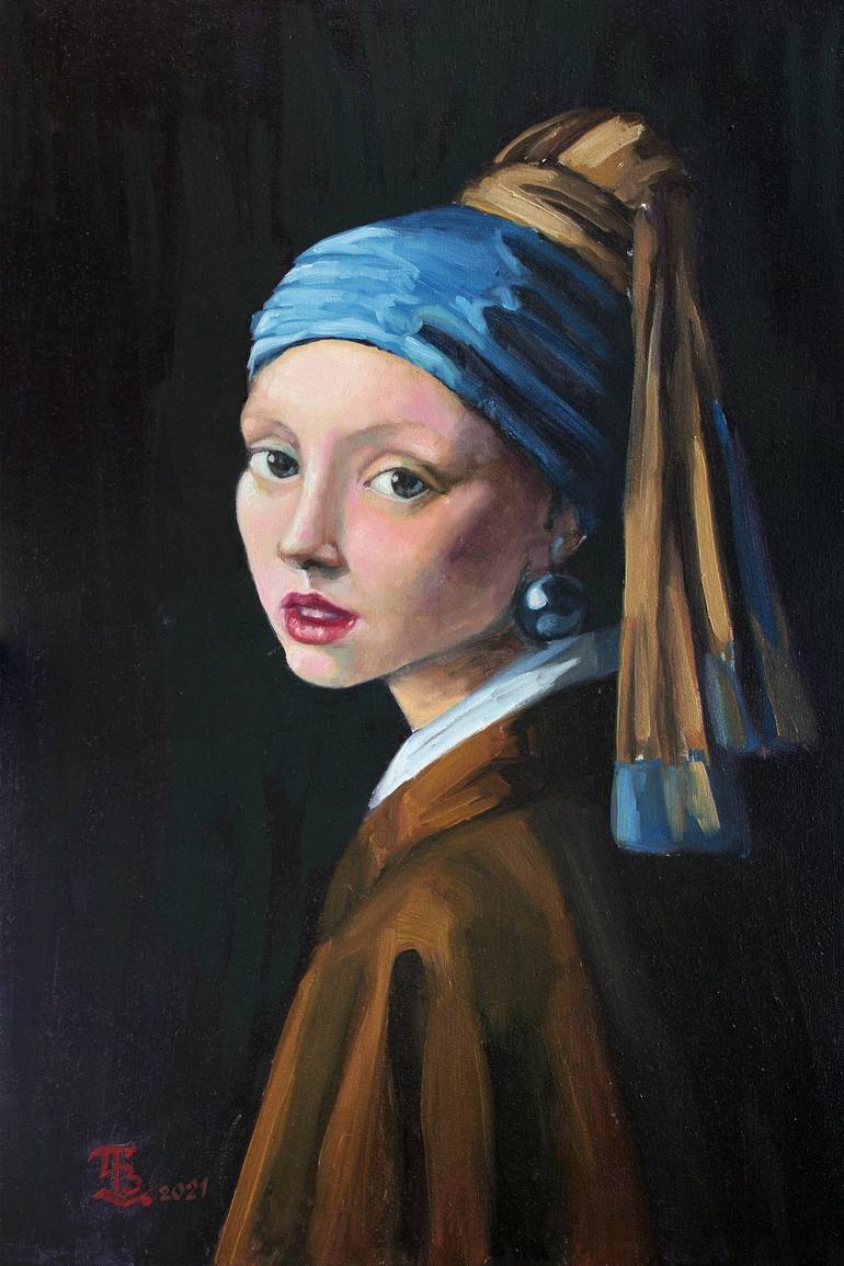 Oil painting “Black Pearl” - based on the painting Jan Vermeer "Girl with pearl earring" I wanted to try the techniques of the great masters and I decided to start with a painting by Jan Vermeer "Girl with pearl earring". It was a very interesting experience and I learned a lot from this beautiful p...