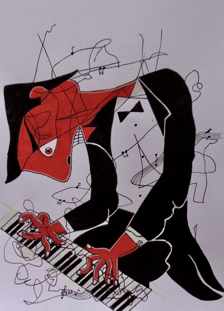This drawing/ painting began as a (blind) scribble from my subconscious which turned into a man feverishly playing his piano.