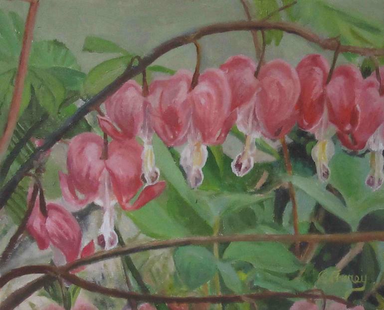 Title: Bleeding Hearts, Medium: Oil on Linen, Size: 11 x 14", Price on request. I have been thinking of paintings these flowers that bloom out my front window every year. They were actually more interesting painting them than I imagined. Hope you like them!