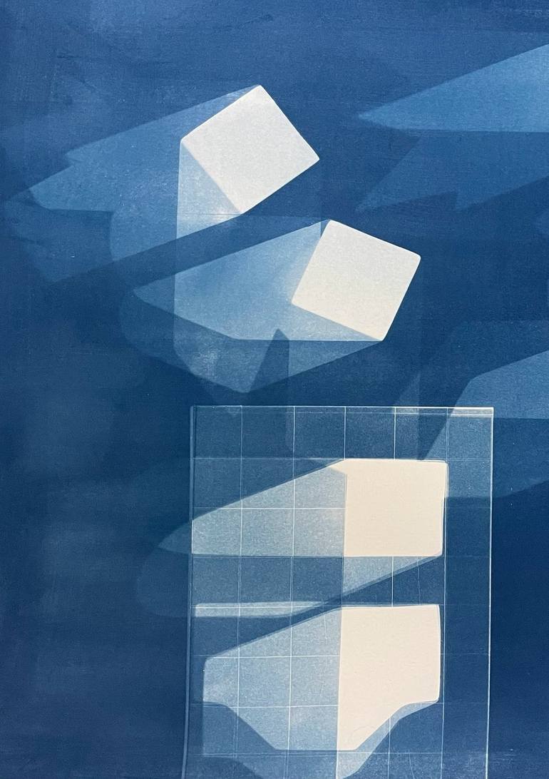 Inspired by historical architectural blueprint techniques, Kaufmann paints with cyanotype and creates the piece with sun and shadows from 3-dimensional objects. The art is created by the sun and time and then set with water and air with the result being a 2-dimensional exposure from a 3-dimensional ...