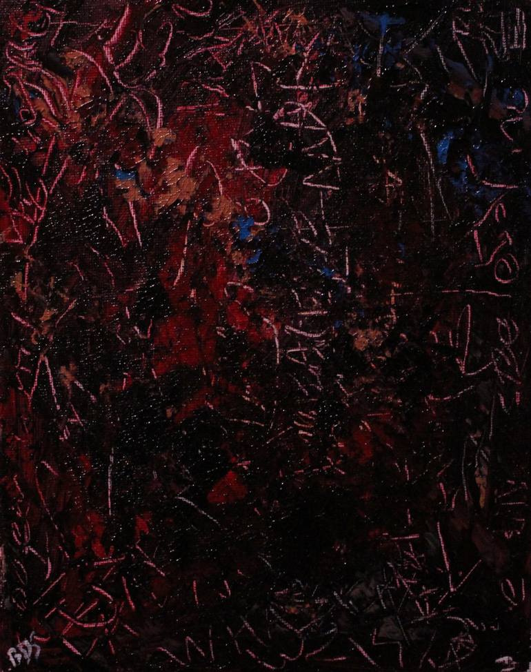 A wall of dark scripture. A confession written in something thicker than ink. Bloody Runes feels less painted than unearthed — like a slab torn from some forgotten chamber where language was never meant to be understood, only felt. Deep reds pulse beneath layers of black, as if something is still a...