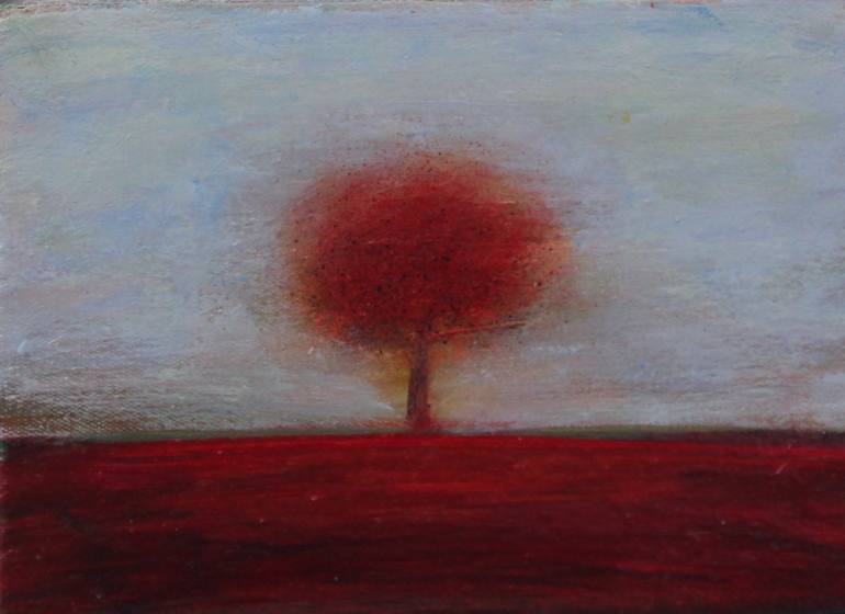 "Bloom" is an original oil painting on canvas, mounted on a deep wooden block. The contemporary artwork depicts a tree in spring, rendered in shades of red. The texture of the oil paint and canvas adds depth to the artwork. The way the light interacts with the surface brings the tree to life, givin...