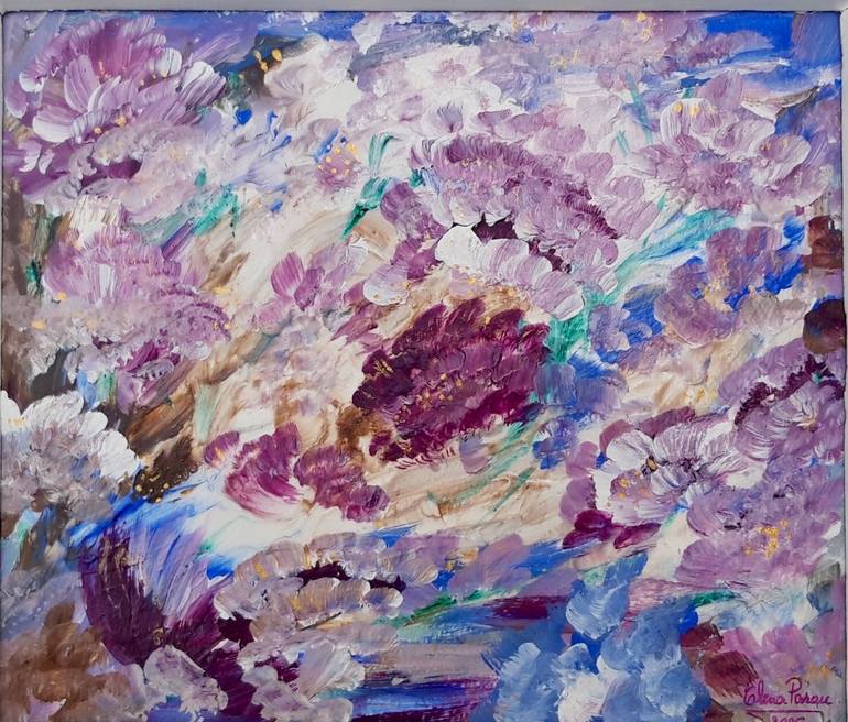 Through optimistic purple colours and their intensity, the artist is trying to show what her perception of this world is. The regal purple from the painting “Blooming 1” tries to tell us about an imaginary world, full of colour and optimism. This painting is part of a series of 2 paintings, Bloomin...