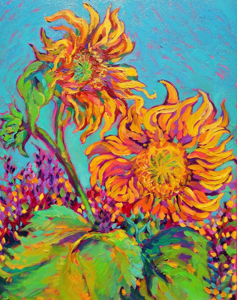 Beautiful summer sunflowers blooming in lavender field. Bright vivid colors of yellow, purple and green. Pink background transperents through. Side painted pink.