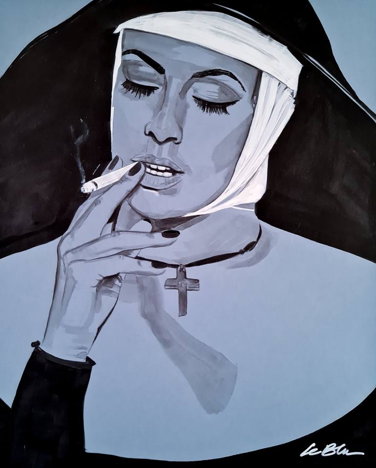 L'Habit ne fait pas le moine. Golden Flow acrylics Carbon Black on Denim Blue Clairefontaine Paint-On paper 250 gram and Posca Markers.