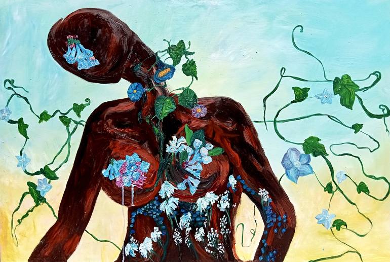 This artwork was inspired by seeing the Blue Bells flowers in nature and imagining them growing in the body as a metaphor for abundance and integration with nature.