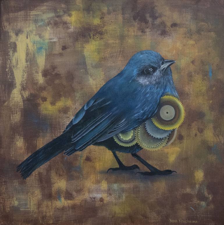 Original acrylic and oil canvas painting. Blue bird, steampunk style. Dimensions: 11.8 W x 11.8 H x 1.37 D inches 30x30 cm, the depth is 3 cm