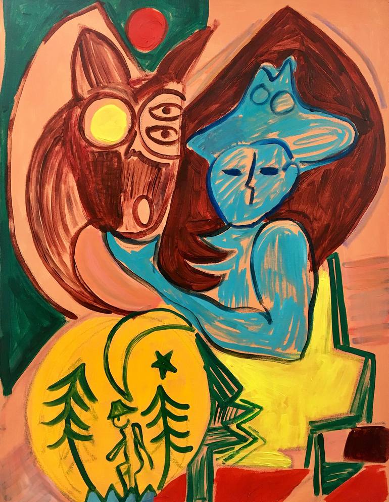I employ bright colors and shapes with acrylics that immediately grab the eye. My work is a bold and memorable display with colors used in signage to noticeably capture an otherwise forgotten moment. The loud colors represent femininity, courage and strength in a modern world. Perhaps related to not wanting to let go of a memory and the desire to be remembered. I am inspired by the vibrant colors and patterns of folk art and crafts. Although color takes precedence in these paintings. Shape interaction and patterns play an important role. They are like rhymes that harmoniously flow through my compositions. My images are dreamy fantasies transforming the subconscious to another place I also think about the autonomous drawings of the surrealist or drawing without conscious thought. Regardless of the common domestic plots there is nothing completely ordinary in my world of painting. They bravely incorporate a carefree style. One moment of creation may not necessarily be safely carried to the next painting. My work has a range of figures, symbols, patterns that switch from recognizable to abstraction. This arrangement exudes a surreal dreamlike quality. The paintings weave in and out of my dreams. They dive into the mind and bounce out to bold world of art. Fantasy transforming into materiality. Ultimately I like to think of how my artwork and femininity takes place in the modern world. I channel memories, ancient wisdom and dreams of women from the past. My patterns and electric colors with dynamic shape interaction bring a new femininity, boldness and bravery, as we face the uncertain future.