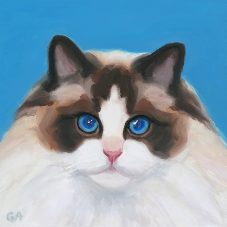 Oil painting on cradled panel, a portrait of a blue-eyed ragdoll cat on a blue background. I love cats, it was a pleasure to paint the cat portrait.