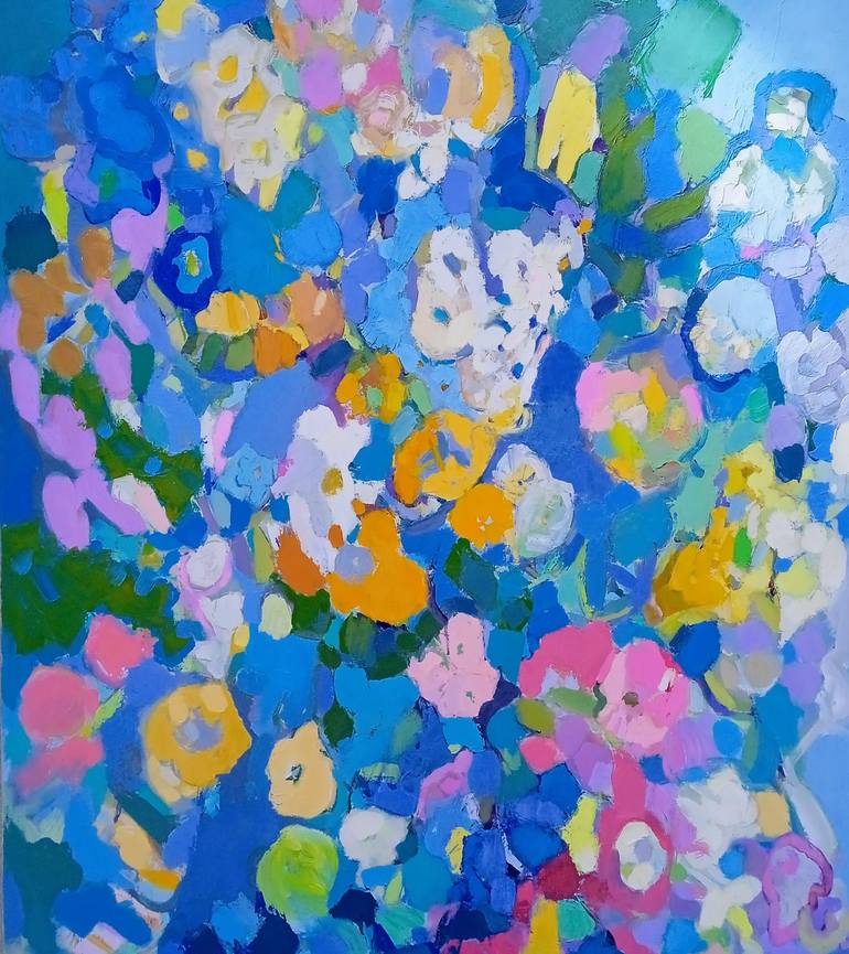 Blue floral spring painting . Oil on canvas, impasto.