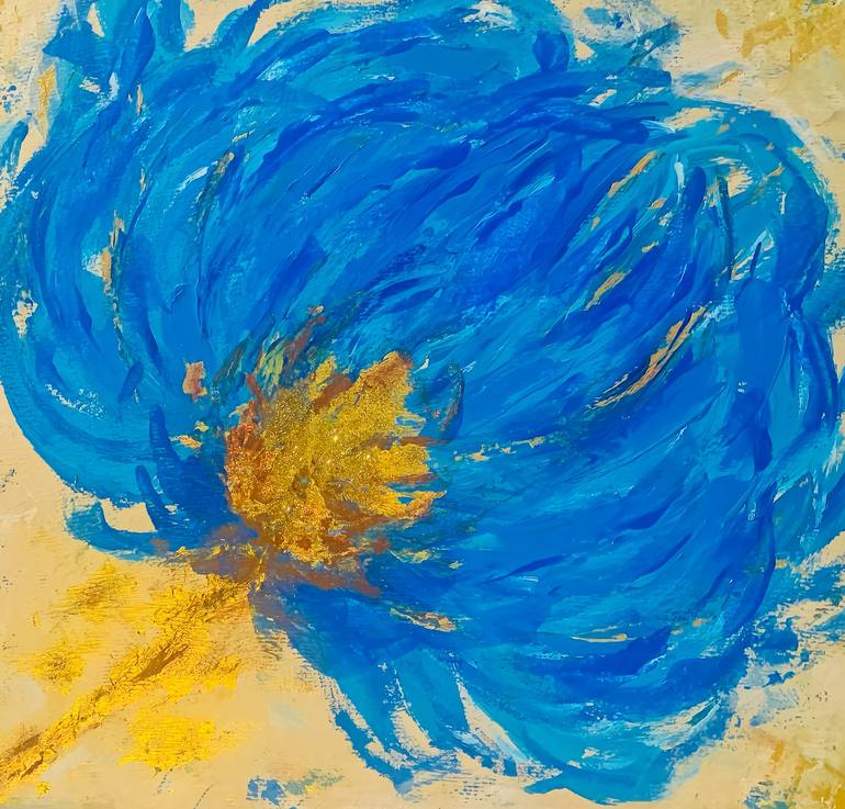 This original abstract painting features blue flowers with a hint of gold inside. The bright colors and abstract forms create a sense of joy and wonder. Crafted with acrylic, gesso and new media on canvas, this piece is a testament to modern art techniques. The artist's skillful use of texture and ...
