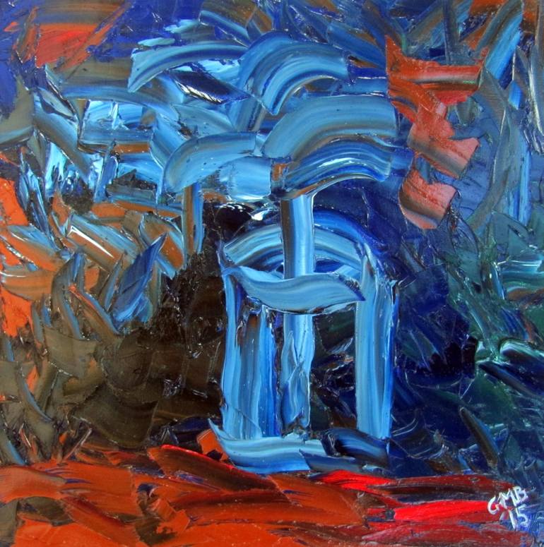 An abstract painting of a blue flower on a red table.