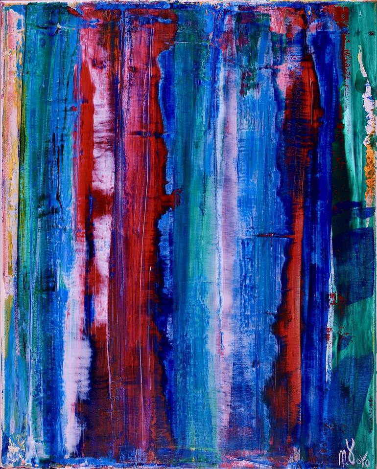 Color Field abstract acrylic with blue, red and some green. Signed, Ready to hang. For this work I used a large palette knife and hand mixed acrylic paint and mediums. The work is completely created spontaneously and is allowed to develop organically with no preconceived direction (inspired by the ...