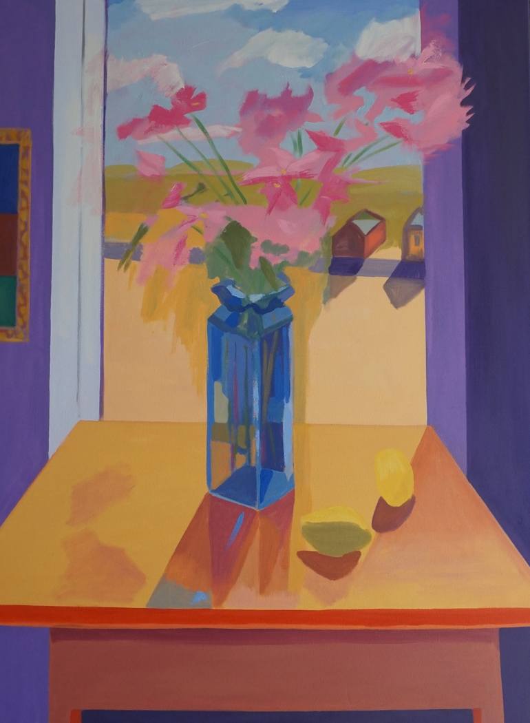 The light upon my blue glass vase inspired this painting. Through the window is a stark landscape with houses. The design is more about abstraction than reality. I look at things around me and simplify them into colors and shapes which convey a three dimensional space. David Hockney has been a stron...
