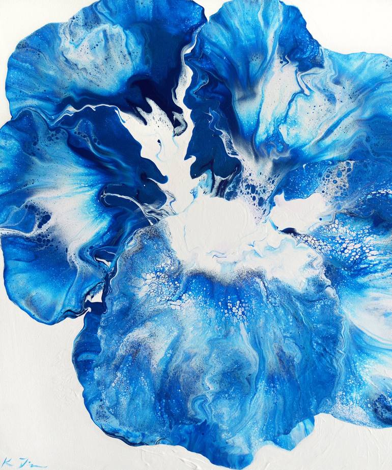 This is acrylic on canvas abstract painting depicting resemblance of blue iris flower. *Title: Blue Iris I *Size: 24 (height) x 20 (width) x 1.5 (depth) inches *Materials: Acrylic paint on wrapped cotton canvas *Style: Abstract, Modern, Contemporary *Finish: Semi-Gloss varnished for long lasting pr...