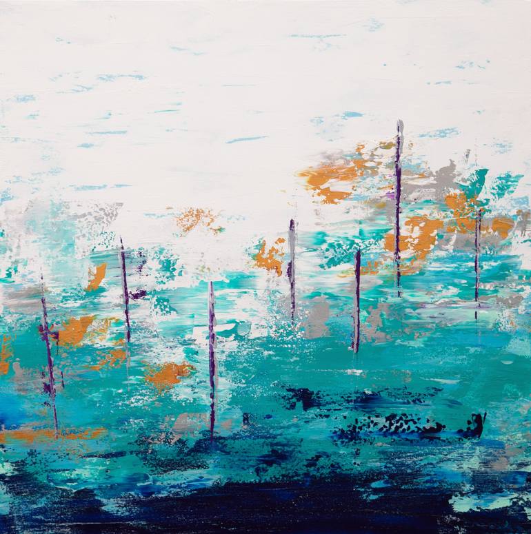 Blue Lake 16 is an original painting, created with acrylic paint on gallery-wrapped canvas. It has a width of 30 inches and a height of 30 inches with a depth of 1.5 inches (30x30x1.5). The painting continues onto the edges of the canvas, creating a finished look so the canvas does not require a fra...