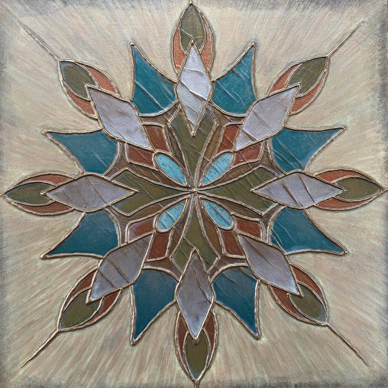 Blue Mandala - A square painting featuring a mandala design with a colorful palette. The central motif is dominated by vibrant turquoise blue, interwoven with metallic colors of gold, rust, and silver. The design has a weathered, rustic feel, with hints of beige adding warmth. The metallic elements ...