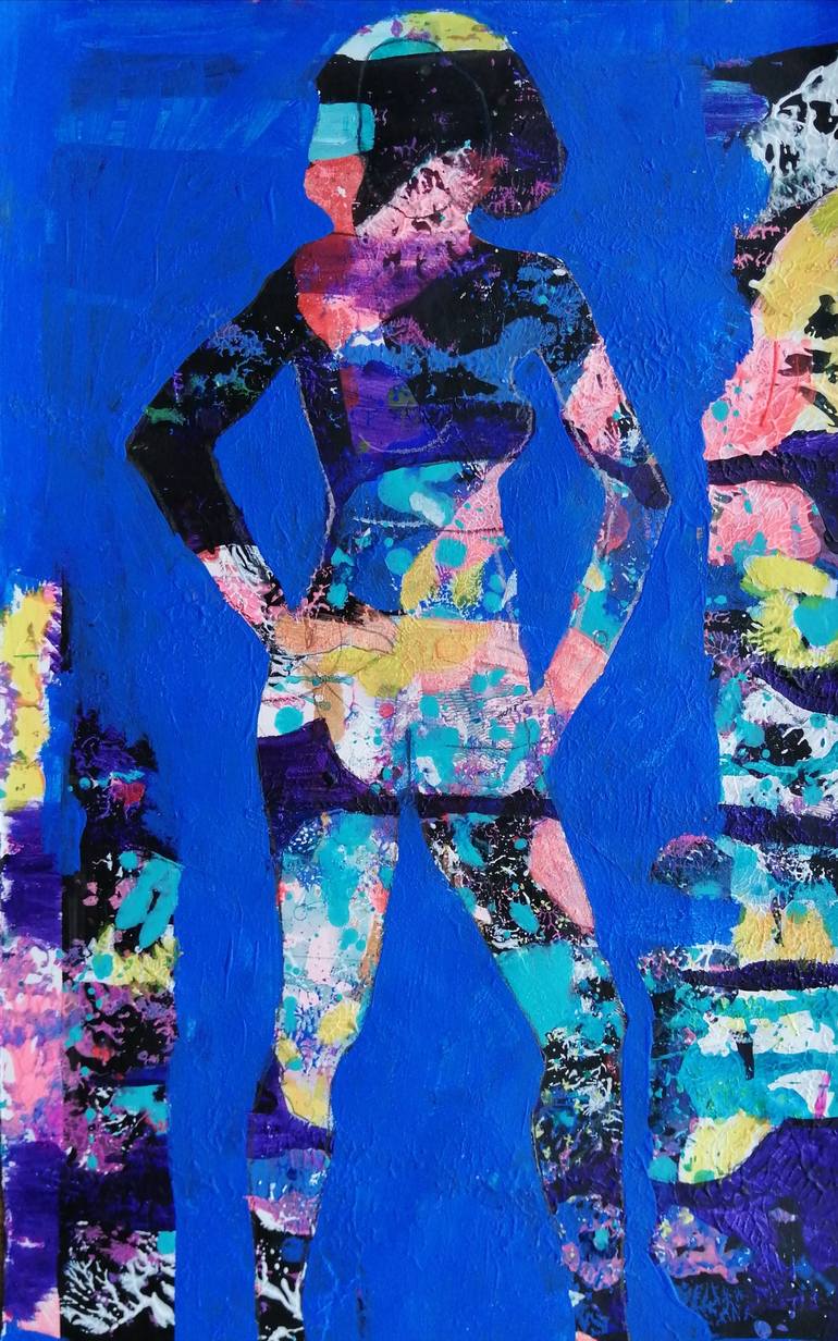 Acrylic painting on paper, using ink and pencil, picturing and female figure with a lots of layers of beautiful colours.