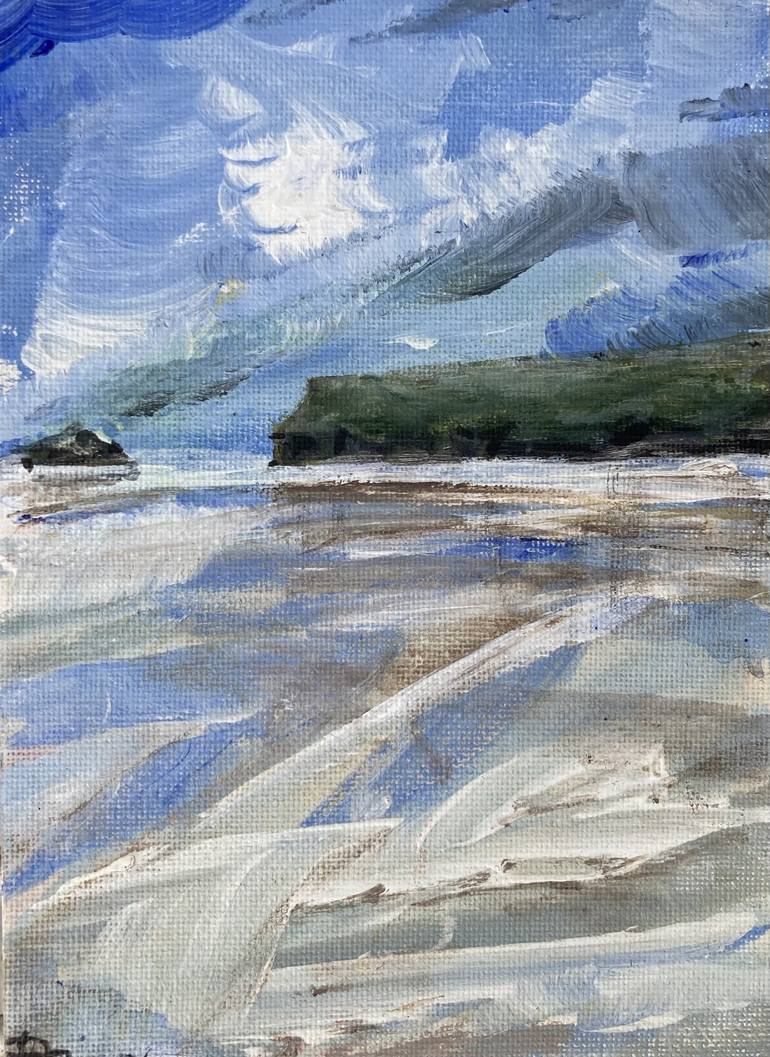 Stunning little piece painted in the morning in the freezing breeze, on the cliff just outside the Polzeath House. The water is playing hide and seek with the sky… and everything is cold and blue.