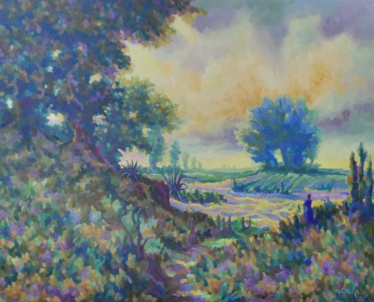 In this painting I try to transmit the feeling of warmth together with the feeling of freedom provided by the contrast of two colors: blue and yellow. The one color evoking the sky and the other the dry grass.