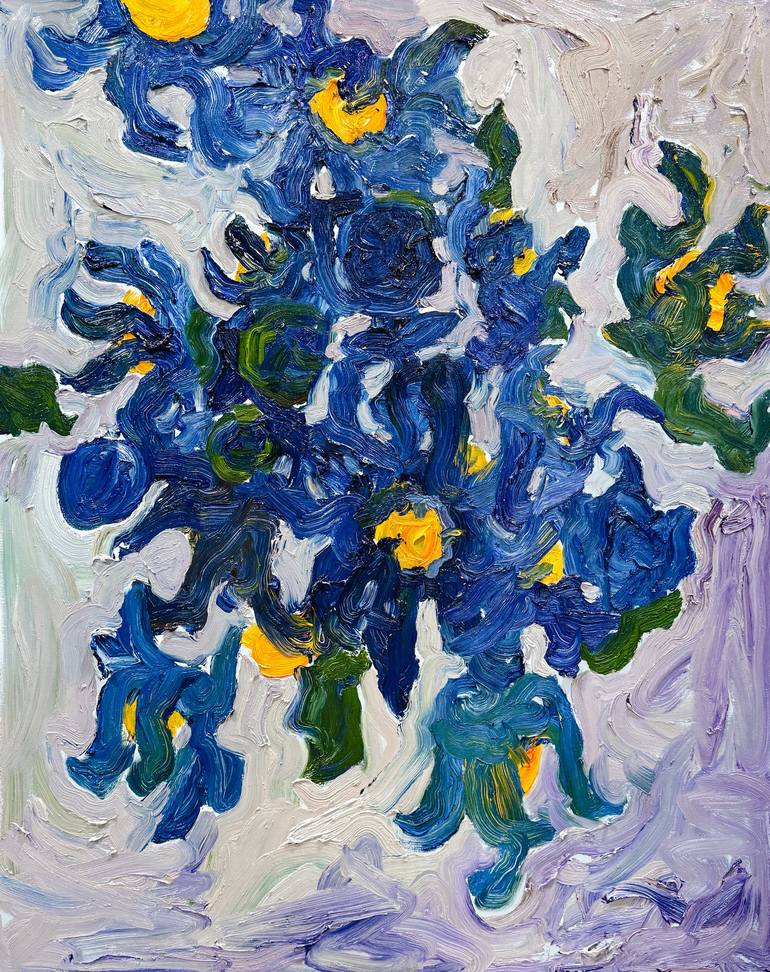 In Blue Cascade, Daniel Zimmerman continues his exploration of gesture and botanical abstraction with a bold, immersive palette. This piece centers around a dynamic arrangement of blue blooms—if they are flowers at all—rippling outward in expressive, saturated strokes. The brushwork is confident and...