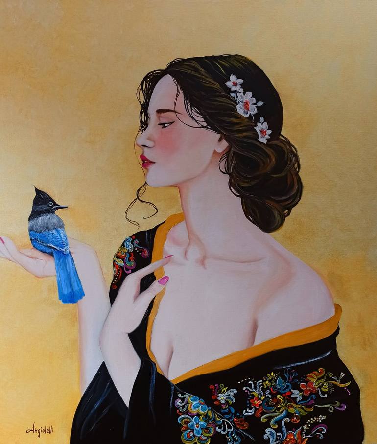 Portrait of an oriental woman with a kimono and a blue bird - painted a golden background with oil colors and acrylic colors on canvas cm.60x70 - signed on the front and colored even on the edges, it can also be hung without a frame
