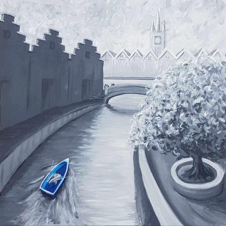 From a series of monochrome works, the blue feature colour highlights the boat being rowed through canals as in a dream.