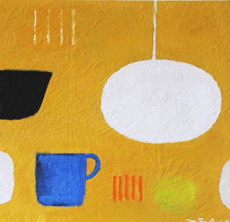 This oil painting on waxed paper was created between 2017 and 2019. It draws inspiration from simplicity in structure; the blue cup is essential.