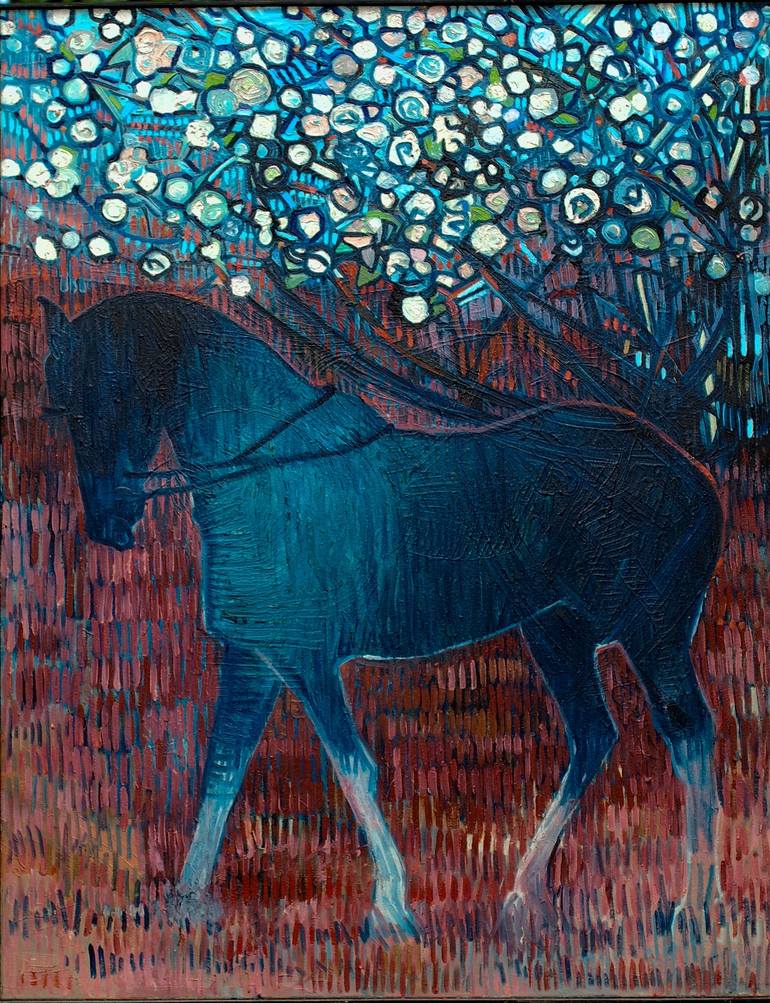 Blue horse on the warm spring ground covered with red grass.and blossom apple trees . Colourfull nature painting. Strong strokes of oil on canvas