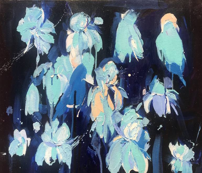 In this expressionist oil painting, I've captured the raw, vivid emotions of nature's ephemeral beauty. I chose a deep blue palette to evoke a sense of mystery and tranquility, spotlighting the ethereal forms of flowers that seem to dance and flicker in an unseen nocturnal breeze. Each stroke is a t...