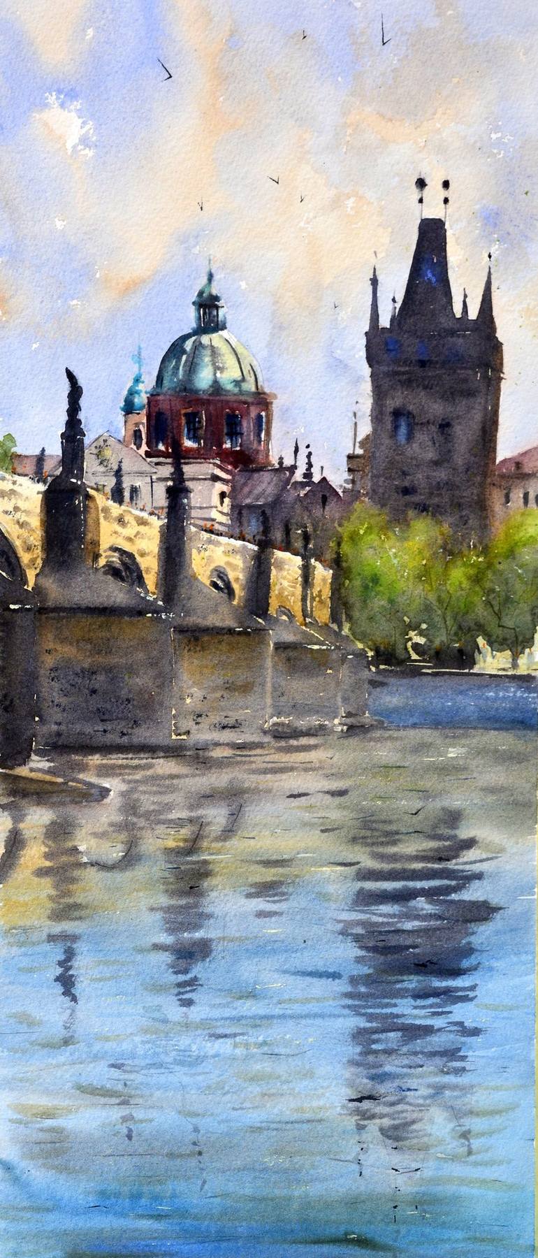 Capture the enchanting allure of Prague with this original watercolor painting by Nenad Kojić. The artwork, titled "Blue sky and Charles bridge reflection at Vltava Prague," transports you to the heart of the Czech Republic, showcasing a breathtaking view of the iconic Charles Bridge mirrored in the...