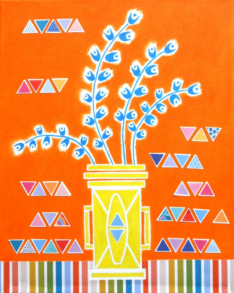 A whimsical still life of a stylized, abstract bouquet of bluebell flowers, in a bright lemon-yellow cannister against a yellow-orange background with multi-colored triangles.