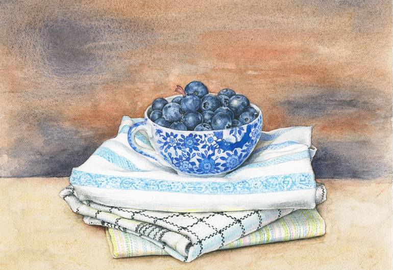 Beautiful original painting - "Blueberries" in a Chinese cup. Painted in realistic style with high quality watercolor paints. Size - 21x30 cm (8 1/4x11 3/4 inch) including white borders. Blueberries is a detailed still life that captures the natural beauty of blueberries in a calm and balanced com...