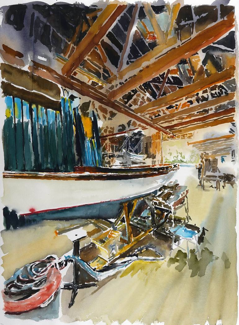I focus on large and medium scale watercolor landscape and portraiture. I started painting in the late 1970’s. After taking a break to run a business and raise a family, I’ve thrown myself back into painting, inspired by my daughter going off to art college. This is an original, watercolor of a boat...