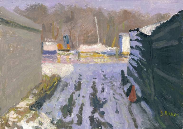 A painting out of a series boathouses I painted two years ago . In different weather conditions, and atmosphere : Spring, autumn,after the rain, in stormy weather, in winter weather and cold. As a genuin plein air painter I use oil color - of course.