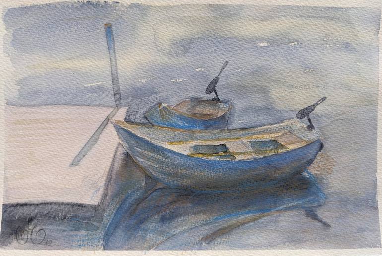 Soothing water of the pond, boats swaying at the pier, the evening sun casts a shadow from the pole for tying boats, summer, Scandinavia. Requires framing Original hand painted fine art one-of-a-kind aquarell Title "Boats at the pier" Materials: watercolor, paper Signed by author. Also comes wit...