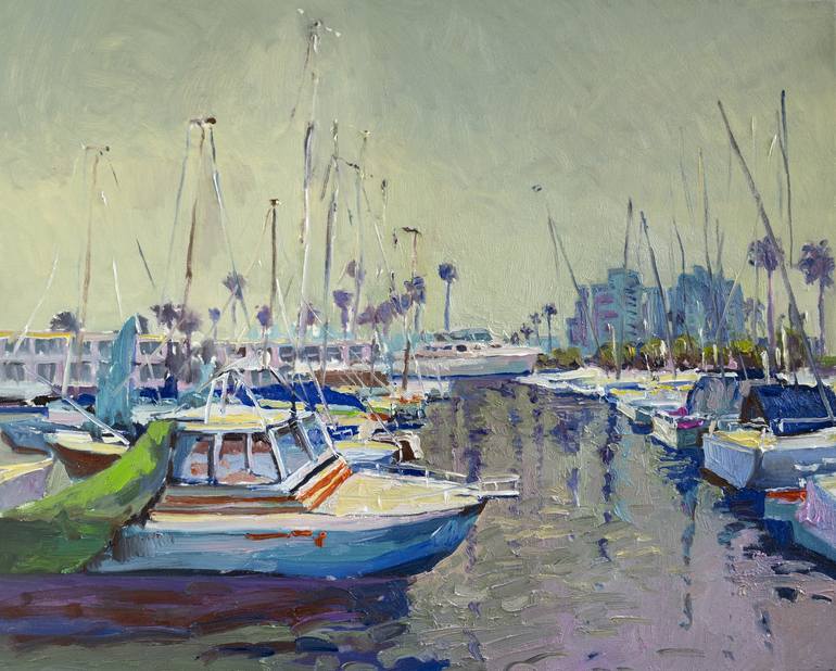 I painted this work in Marina Del Ray, California. Gloomy morning light, full of peace, and the calm mood gets reflected from the water. Shapes of boats, palm trees in the background, and beautiful calm sky all together create a nice harmony. The artwork is painted on oil-primed canvas. The sides ar...
