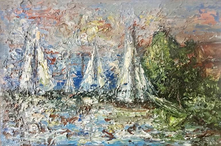Boats on the lake at sunset original oil impasto style painting on large canvas,heavy textured,one of a kind artwork.