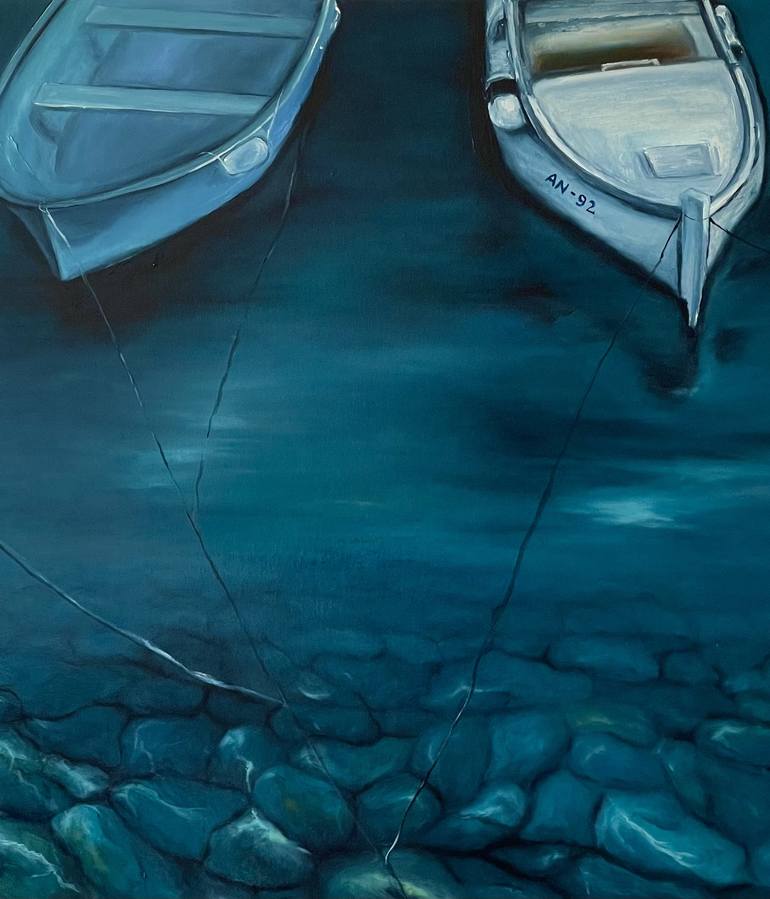 "Boats" oil on canvas 60x70 cm Original landscape with two boats, reflection on the sea and rocks. Looking at the picture I just want to dive into the breezy, crystal, clear water. The work is made in the style of classic multilayer painting. Materials: Painting is made with a professional oil-bas...