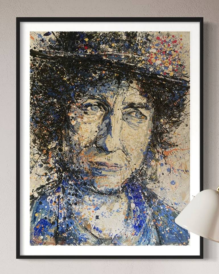Bob Dylan portrait inspired by the singer song writer poets work particularly visually inspired by famous performance of Tangled up in blue. Created in a layered style with dynamic use of various modes of mark making including brush stroke, palette knife, drips and splashes which come together to pr...